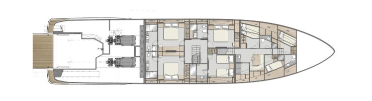 Il ponte inferiore ospita quattro cabine per gli ospiti, completando un totale di cinque cabine complessive, con un’impostazione che mira a mantenere standard elevati di privacy e funzionalità. In questa taglia, il compromesso corretto non è “fare cabine più grandi a ogni costo”, ma distribuire volumi e impianti in modo che i locali tecnici restino accessibili e che il comfort acustico non venga sacrificato. Una cabina leggermente meno ampia ma più silenziosa e stabile vale spesso di più, nell’esperienza reale, di qualche centimetro in più di superficie.