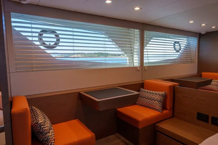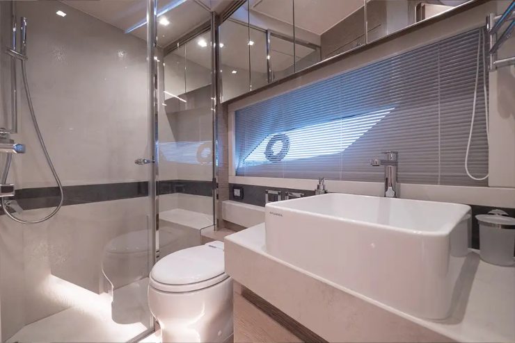 L’armatoriale di mezzanave sfrutta il baglio massimo con letto centrale, guardaroba integrati e bagno en suite con doccia separata. La VIP di prua beneficia di volumi generosi grazie all’altezza d’opera; la terza cabina è la carta jolly: ottimale per equipaggio, bambini o ospiti. Le finiture miscelano essenze naturali, tessuti tecnici e pelli marine con cerniere ammortizzate e ferramenta inossidabile che riduce vibrazioni e scricchiolii nel tempo.