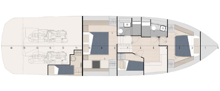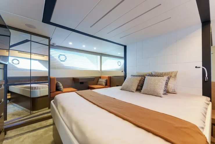 La scala dolce introduce a un living luminoso: cucina con elettrodomestici marini, piani in composito e stivaggi profondi. L’armatoriale centrale è il cuore privato: letto king, stivaggi a tutta altezza e bagno dedicato. La VIP di prua offre volumetrie generose e un bagno condiviso con box doccia, mentre la terza cabina mantiene flessibilità di letti e può diventare cabina equipaggio all’occorrenza. La climatizzazione stabilizza temperatura e umidità anche con estivi prolungati.