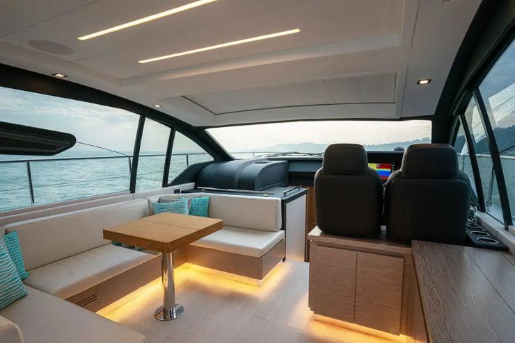 Il pozzetto è un salotto all’aperto: dinette convertibile, wet bar integrato e prendisole che dialogano con la plancetta poppiera idraulica. I passavanti sono ampi e protetti per movimentare ospiti e bambini in massima sicurezza. Sotto coperta, beneficia di illuminazione indiretta, pavimenti con grip marino e superfici facili da pulire. La climatizzazione canalizzata raggiunge ogni comparto con diffusori dedicati, stabilizzando temperatura e umidità in modo uniforme.