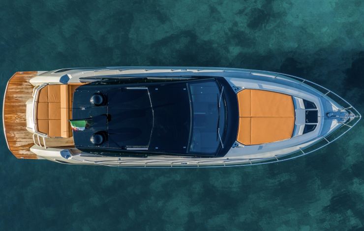 Le superfici tese e le vetrate longitudinali alleggeriscono visivamente il profilo e, al contempo, illuminano gli interni. L’hard top con apertura ampia modula il passaggio aria-luce senza compromettere l’integrità strutturale; la poppa integra garage e plancetta in maniera pulita, con scalini e corrimani posizionati per un movimento intuitivo dell’equipaggio.
