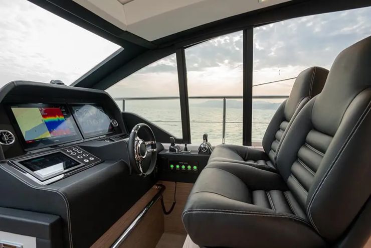 La timoneria è centrata su display multifunzione di grande formato con integrazione carteggio, radar, ecoscandaglio e diagnostica motori. Il bus digitale governa utenze e scenari: imbarco/ormeggio, crociera diurna, notte, silent mode all’ancora. La logica impiantistica separa i carichi critici dalle linee ausiliarie per limitare cadute di tensione e agevolare la diagnosi. L’autopilota, con funzioni avanzate, lavora in sinergia con i pod per manovre millimetriche e mantenimento rotta preciso.
