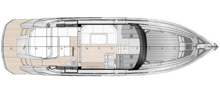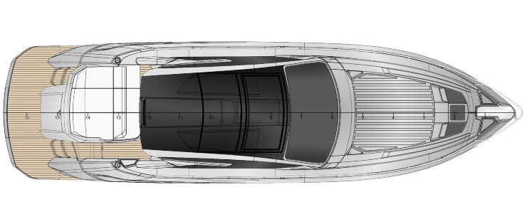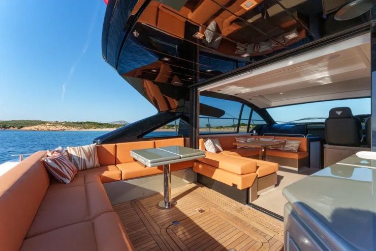 Dal bagno di poppa si accede a una plancetta idraulica robusta che agevola tender e giochi d’acqua. Il pozzetto integra una dinette modulare, mobile bar completo e prendisole su due livelli. L’hard top—con apertura ampia—estende l’ombreggiamento sul salone di coperta. I passavanti larghi, con tientibene continui, portano al solarium di prua, configurabile con schienali regolabili.