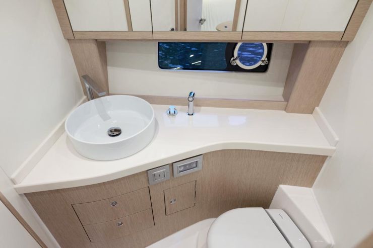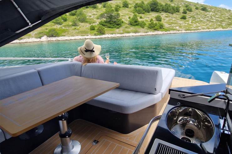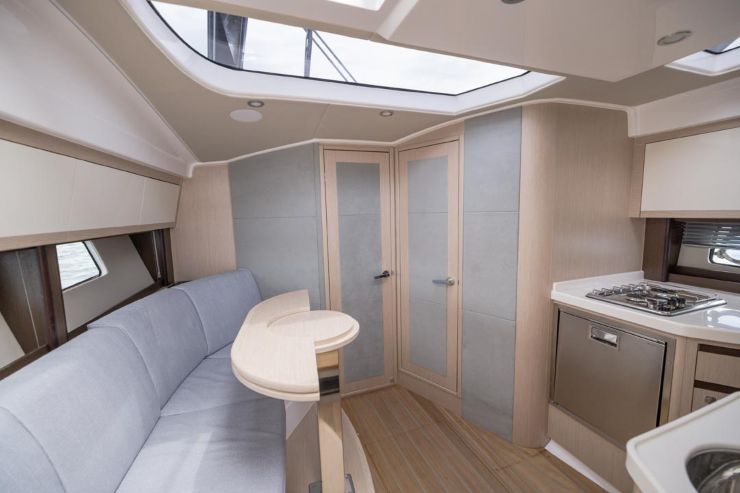 Il bagno con doccia risponde a ciò che serve davvero in questa taglia: praticità, materiali resistenti, ventilazione corretta e facilità di pulizia. La cucina interna, abbinata alla zona esterna, asseconda l’uso reale della barca: pasti veloci, colazioni, gestione della giornata in mare. L’obiettivo non è stupire con soluzioni complesse, ma offrire una funzionalità solida e coerente con l’anima sportiva dell’unità.