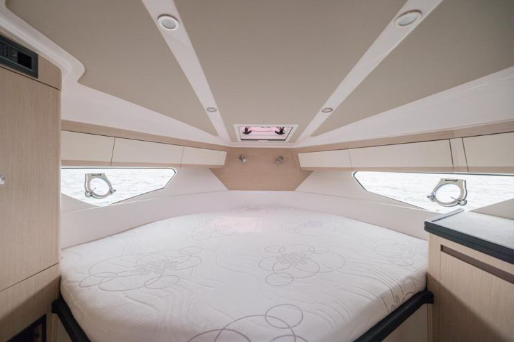 Sottocoperta, la Focus Power 36 punta su una logica chiara: una cabina di prua con letto generoso e volumi ben sfruttati, una cabina di poppa che utilizza efficacemente lo spazio sotto il pozzetto, e una dinette che completa la vivibilità. Il risultato è una barca che può ospitare quattro persone con dignità, senza trasformare ogni movimento in un compromesso. La luce naturale, grazie a finestrature laterali e aperture superiori, migliora la percezione degli spazi e rende più piacevole la permanenza a bordo.
