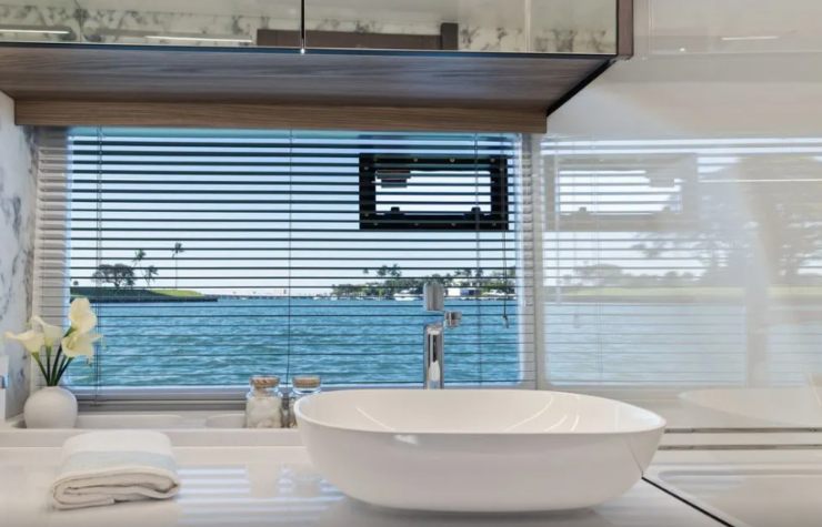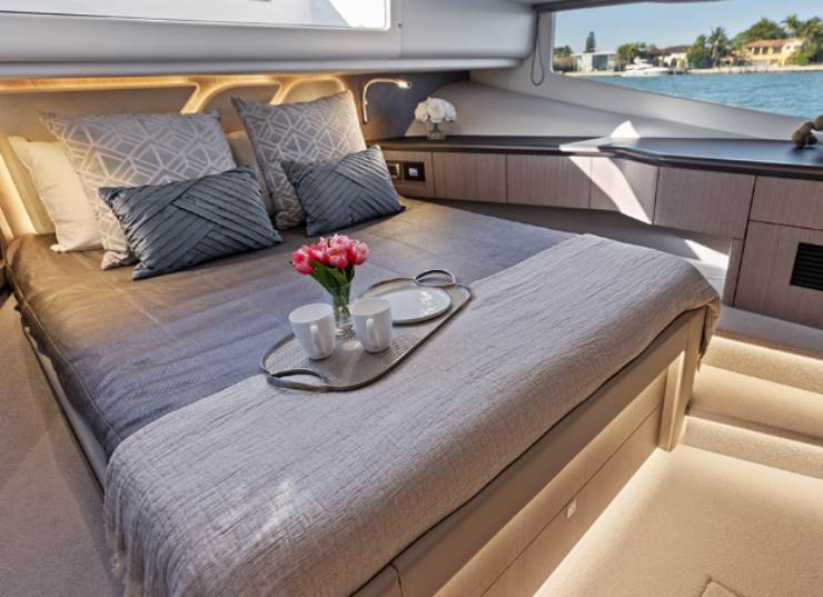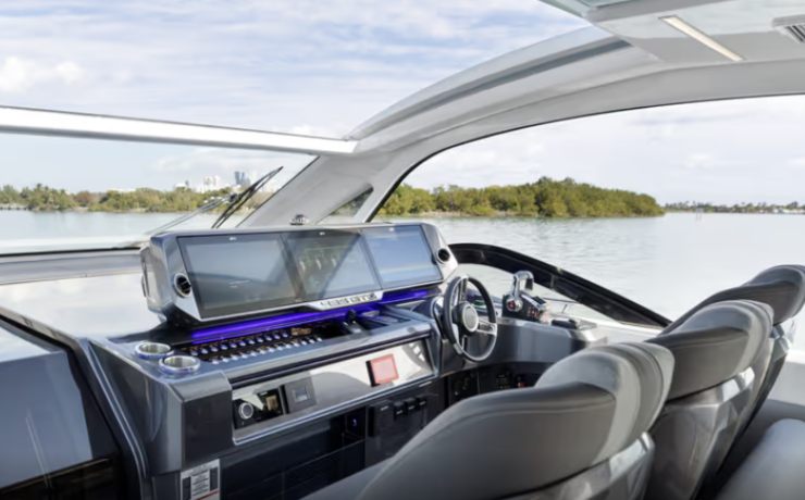 La plancia accoglie fino a tre chartplotter Raymarine Axiom 16” (opzioni), radar Quantum Q24C, VHF RAY91 con AIS, autopilota e joystick Mercury con SkyHook (posizionamento dinamico). Il sistema d’illuminazione LED è dimmerabile e scenografico (interni/esterni), con pacchetti underwater a 7–8 corpi luce. L’impiantistica è dimensionata per l’uso “all season”: generatori 12 kW insonorizzati, clima Dometic 56.000 BTU con doppia zona (interna + helm), doppio collegamento shore power 120V/30A e 50A, batterie servite da caricabatterie e quadro AC/DC con protezioni dedicate.