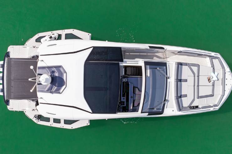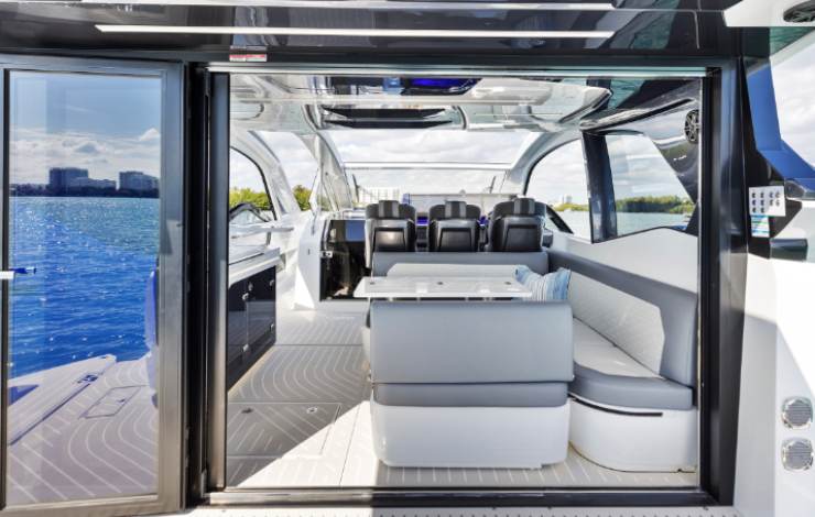 La firma stilistica è quella dei modelli GTO: parabrezza integrato con hardtop e vetrate estese, fiancate finestrate a tutta lunghezza, terrazze laterali apribili che “sdoppiano” il pozzetto in lounge a pelo d’acqua. A prua, l’open bow è un salotto indipendente, con sedute profonde e tavolo trasformabile; al centro, la timoneria è arretrata quanto basta per protezione aerodinamica senza sottrarre aria e luce alla dinette; a poppa, la piattaforma è segmentata dalla tripla motorizzazione, ma i camminamenti sono ampi e continui. Sottocoperta, due cabine vere: armatoriale a prua con volumetria e altezza “best in class” e doppia a centro barca; toilette separata con box doccia e finiture in Corian.