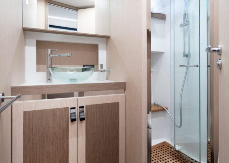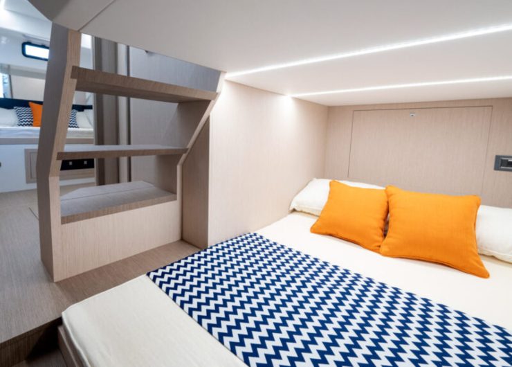 Il sottocoperta ospita una cabina armatoriale a prua con letto centrale, una cabina ospiti a centro barca con letto ampio e un bagno con box doccia separato e altezze generose. L’uso di essenze chiare e la gestione attenta dei volumi negativi (sotto sedute e gradini) aumenta la sensazione di spazio e migliora lo stivaggio. L’insieme è pensato per due adulti in pieno comfort, con possibilità di ospitare altri due posti letto per weekend allungati.