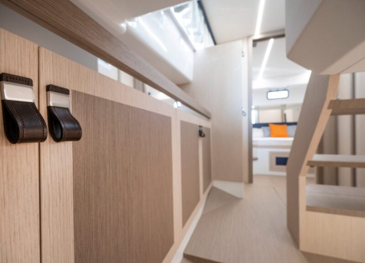 Sottocoperta prevalgono essenze chiare, laminati marini per le superfici maggiormente esposte all’usura, imbottiti nautici resistenti alla salsedine e metallerie in acciaio inox AISI 316 nelle aree critiche. Gli arredi sono ancorati su basi irrigidite, con fissaggi accessibili: niente scricchiolii, niente risonanze, minima manutenzione straordinaria. L’insieme restituisce qualità tattile e pulizia formale.