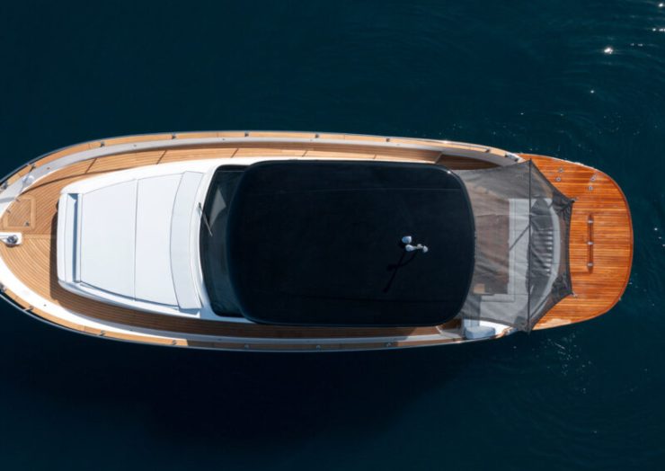 Il corpo scafo è realizzato in GRP/vetroresina con stratificazioni differenziate e rinforzi nei punti di carico. La coperta, anch’essa in composito, dialoga con lo scafo tramite giunzioni robuste e sigillate. Le superfici di calpestio in teak migliorano grip e comfort termico; le murate proteggono senza appesantire la linea. Questa combinazione assicura rigidità, smorzamento vibrazionale e facilità di ripristino in caso di urti leggeri.