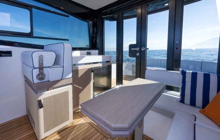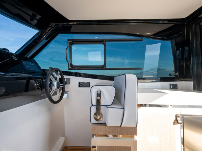Strumentazione in linea di vista, superfici anti-riflesso, supporti per avambracci in manovra, comando motori posizionato per evitare torsioni del polso: piccoli dettagli che, sommati, fanno la differenza in una giornata intera al timone. La visibilità a 360° è ampia, con montanti studiati per ridurre i coni d’ombra.