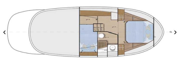- Layout: salone a livello ponte con cucina lineare; 2 cabine; 1 bagno con box doccia