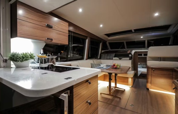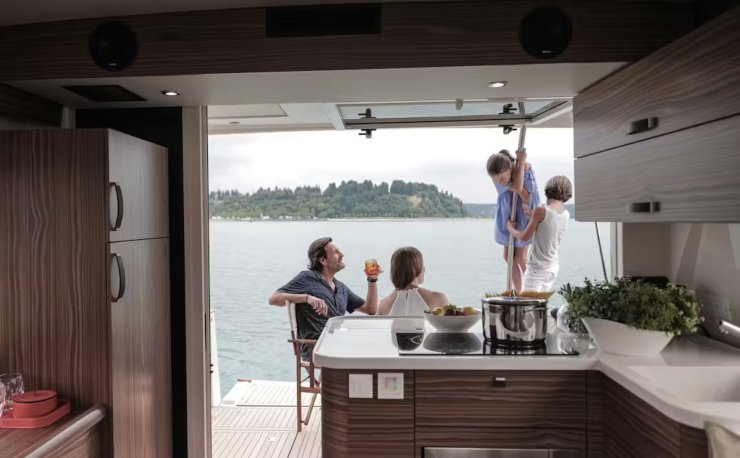Gli interni sono progettati per essere vissuti davvero: superfici facili da mantenere, scelte che privilegiano la funzionalità e una sensazione di “casa sul mare” coerente con l’idea di autonomia. La qualità percepita non è affidata a decorazioni eccessive, ma a dettagli costruttivi, accoppiamenti puliti e una distribuzione razionale degli spazi e degli impianti.