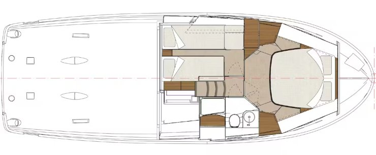 La configurazione tipica prevede due cabine e un bagno, con un’attenzione evidente alla luminosità e alla ventilazione. La cabina armatoriale a prua è progettata per un uso continuativo, con altezze e superfici utili coerenti per la taglia. La cabina ospiti, spesso con letti separati trasformabili, supporta bene la crociera familiare o con amici, mantenendo un livello di privacy adeguato.