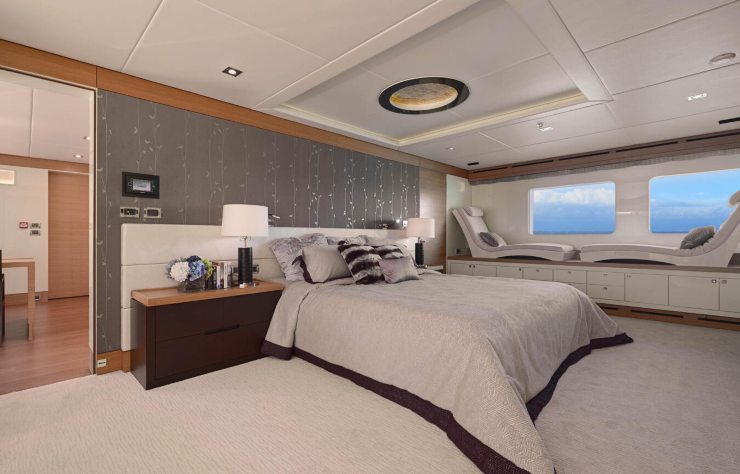 La cabina armatoriale valorizza il baglio massimo con bagno en suite, walk-in e corner lounge. Le cabine ospiti ripetono uno schema simmetrico per facilitare housekeeping e manutenzione. Tra gli optional più richiesti figurano palestra, sauna e vasca idromassaggio sul sun deck, oltre a una sala massaggi o a uno studio privato.
