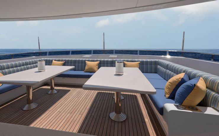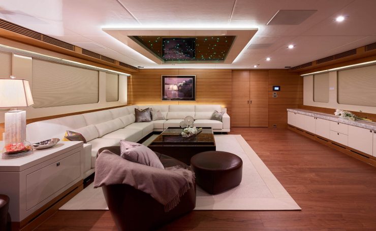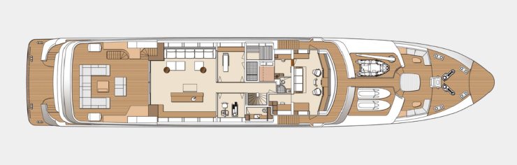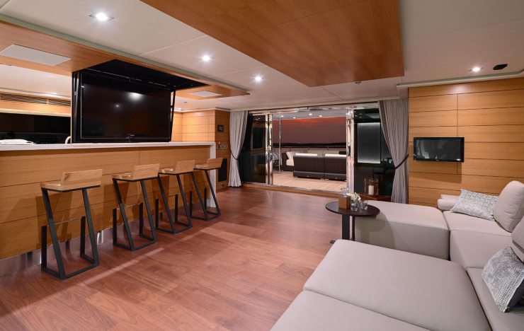 Il main deck ospita un salone luminoso che dialoga con terrazze e camminamenti protetti. Lo sky lounge offre un secondo living più raccolto, ottimo per navigazione o cinema serale. A prua, sedute ribassate riparano dal vento apparente; a poppa, il beach club integra bar, dayhead e spazi per water toys, consentendo un utilizzo del mare immediato e comodo.