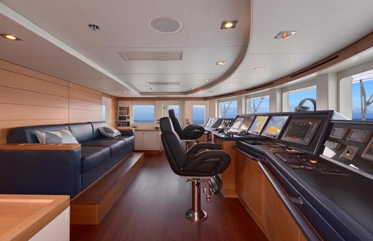 La plancia offre postazioni duplicate e interfacce intuitive per radar doppi, autopilota, AIS, chartplotter e monitoraggio di impianti e tank. La filosofia è il fail-operational: in caso di guasto, la continuità di navigazione è garantita da ridondanze hardware e percorsi alternativi di cablaggio.