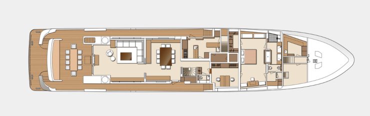 La distribuzione tipica prevede cinque cabine per dieci ospiti, con suite armatoriale a tutto baglio, due VIP e due twin. Questo canovaccio può variare su richiesta, ma l’idea cardine rimane garantire circolazioni indipendenti equipaggio/ospiti, facili per la gestione quotidiana e per le procedure di sicurezza.