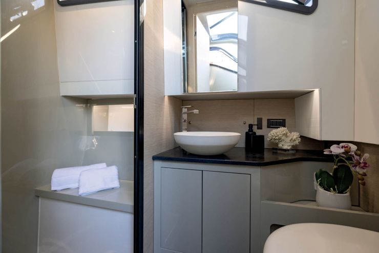 Il bagno, situato su un lato del corridoio, è equipaggiato con WC marino, lavabo e doccia separata tramite paratia o box. Anche qui, la filosofia progettuale è quella dello yacht compatto: superfici facili da asciugare, ergonomia curata, spazi per riporre prodotti da toeletta e biancheria. Nel complesso, il pacchetto di allestimenti sottocoperta permette di affrontare crociere di più giorni con un livello di comfort superiore a quanto ci si aspetterebbe da un RIB.