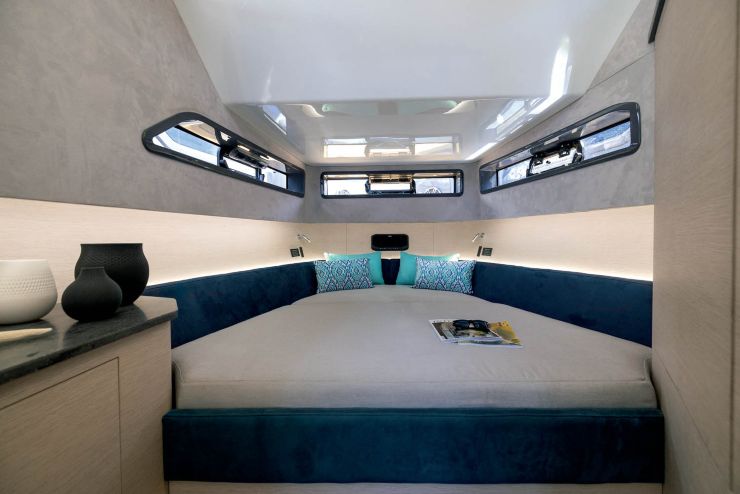 Scendendo sottocoperta attraverso l’apertura ricavata a lato della consolle, si entra in un ambiente luminoso e razionale. A prua trova posto la cabina armatoriale, organizzata attorno a un letto matrimoniale di generose dimensioni con accesso laterale, armadiature, mensole e vani chiusi. L’altezza interna all’ingresso permette di muoversi agevolmente, mentre l’area verso prua è dedicata alla zona notte.