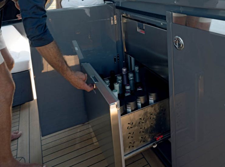 La parte poppiera del ponte ospita un ampio pozzetto modulare, cuore della vita all’aperto. Un grande divano a “L” o a “U” (a seconda delle personalizzazioni) avvolge un tavolo centrale trasformabile, capace di accogliere un numero importante di ospiti per pranzi e aperitivi. Il mobile cucina esterno, posizionato in prossimità del blocco sedute di guida, è una vera cucina in miniatura: piano cottura, lavello, frigorifero e spazi di contenimento adeguati a un utilizzo intensivo.