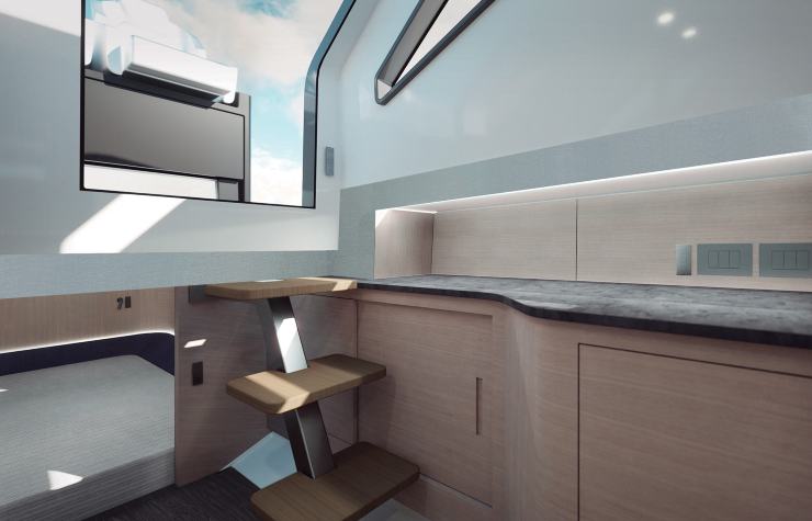 La scelta di materiali chiari, superfici laccate e inserti in tessuto contribuisce a rendere lo spazio visivamente più ampio. La presenza di oblò, boccaporti apribili e punti luce LED ben posizionati garantisce illuminazione naturale e artificiale adeguata, rendendo l’ambiente accogliente anche durante la permanenza prolungata a bordo.