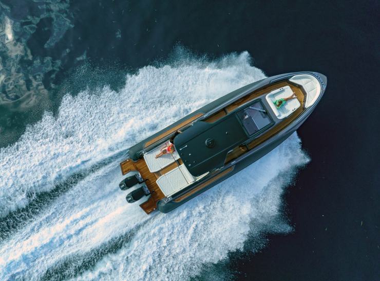 L’impostazione generale privilegia una coperta fortemente sviluppata in lunghezza, con un’ampia area poppiera destinata alla convivialità e una prua organizzata come lounge diurna. Nonostante la vocazione “open”, la tuga centrale nasconde un ambiente sottocoperta sorprendentemente voluminoso, dove trovano spazio due cabine e un bagno completo: una combinazione non scontata su un RIB, anche di queste dimensioni.