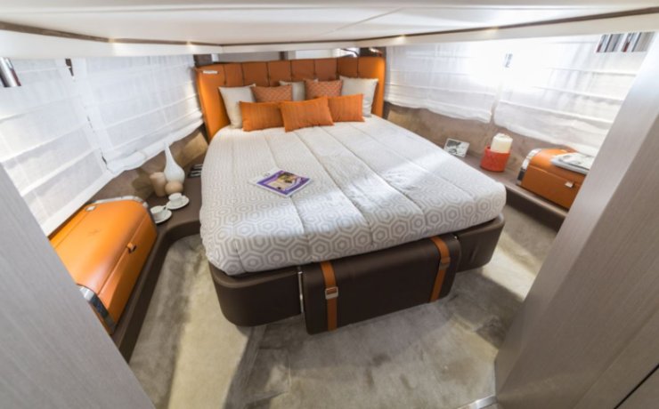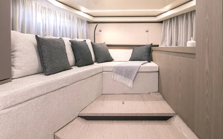Sottocoperta, la volumetria generosa consente un open-space convertibile a prua (dinette/letto) e un locale cabina a mezzanave che può configurarsi con letto matrimoniale o twin. Il bagno, a volume pieno, adotta box doccia separato e arredi sospesi per massimizzare passaggi e stivaggi. Particolare cura è posta a illuminazione, isolamento termo-acustico, punti USB/230V e climatizzazione canalizzata. Nel complesso, l’abitabilità è superiore alla media della categoria, con altezze utili e accessibilità ai vani tecnici ben studiate.
