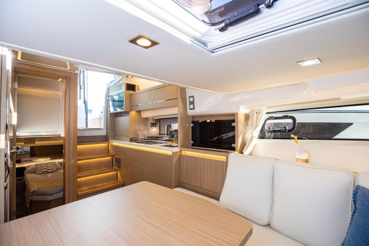 Lo stile riprende i tratti iconici della gamma: linee tese, spalle pronunciate e T-top strutturale. A poppa il pozzetto è concepito come un salotto all’aperto che si riconfigura rapidamente: tavolo abbattibile, divaneria modulare, gavoni in asse e cucina esterna con possibilità di grill, piano cottura e refrigerazione multipla.
