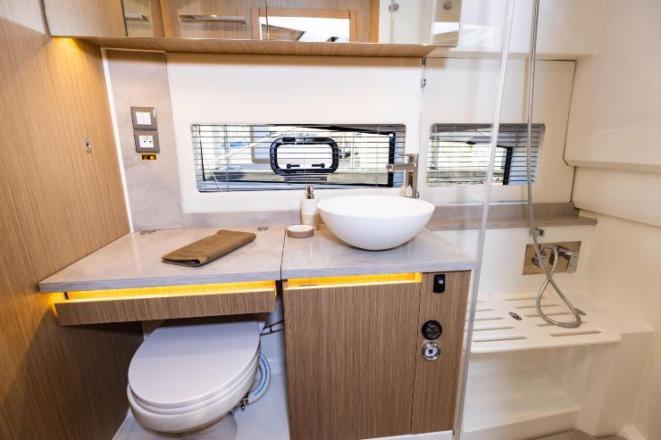 Sottocoperta, il 12.5 WA propone un’armatoriale di poppa che, a seconda della configurazione, unisce due letti per ricavare un matrimoniale extra-large. Il quadrato centrale si trasforma in ulteriore matrimoniale e ingloba spazi contenitivi utili per cambusa “leggera”. Il bagno con box doccia separato segna lo scarto rispetto ai walk-around più piccoli: è uno spazio reale, con altezza e volumi adeguati a un uso quotidiano.