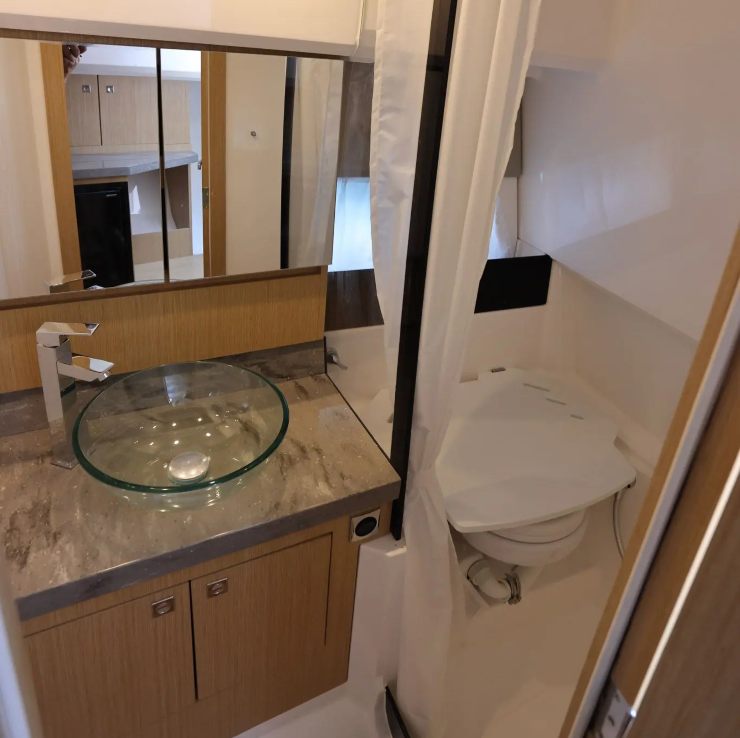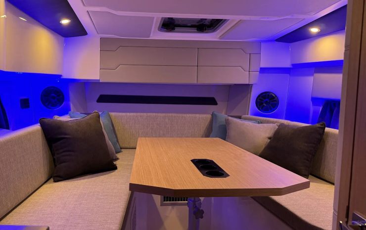 La CS10-S offre una cabina di prua o open space convertibile, con altezza utile ottimizzata e volumetrie smart: pensili soft-close, stipetti illuminati e bagno completo con WC marino, lavello e doccia. I materiali interni prediligono tonalità chiare per amplificare la percezione spaziale.