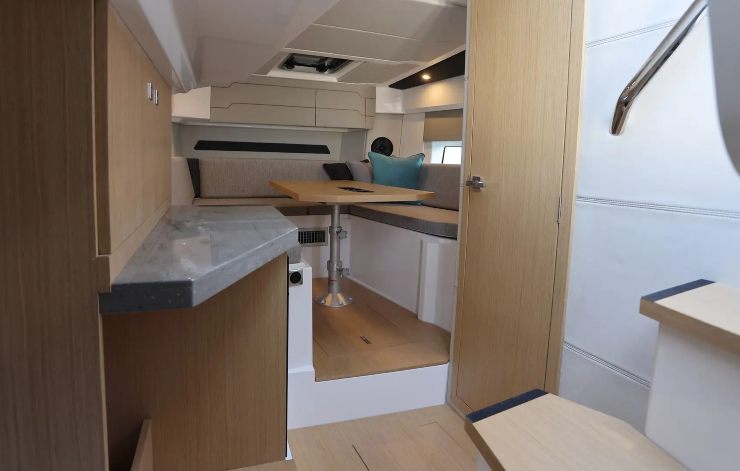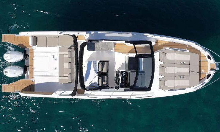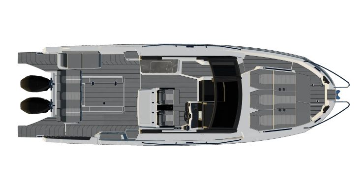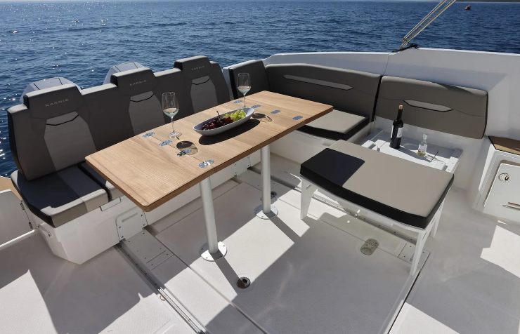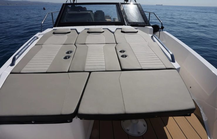 In coperta la vivibilità è il punto di forza: la dinette modulare consente in pochi passaggi di passare da lounge a pranzo completo; ombreggiatura estesa con T-Top e tendalini di poppa; doccia esterna con serbatoio capiente. I piani di calpestio sono continui e antiscivolo, con spigoli addolciti e passaggi larghi anche per bimbi e ospiti meno esperti.