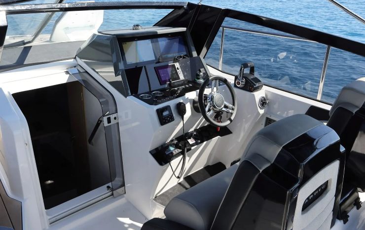 La plancia supporta doppi MFD da 12–16”, con rete NMEA 2000 per sensori motore, carburante, antivegetativa ultrasonica (se presente), dati vento/velocità e integrazione con autopilota, radar a stato solido e AIS. La disposizione dei display privilegia colpo d’occhio e leggibilità in pieno sole.