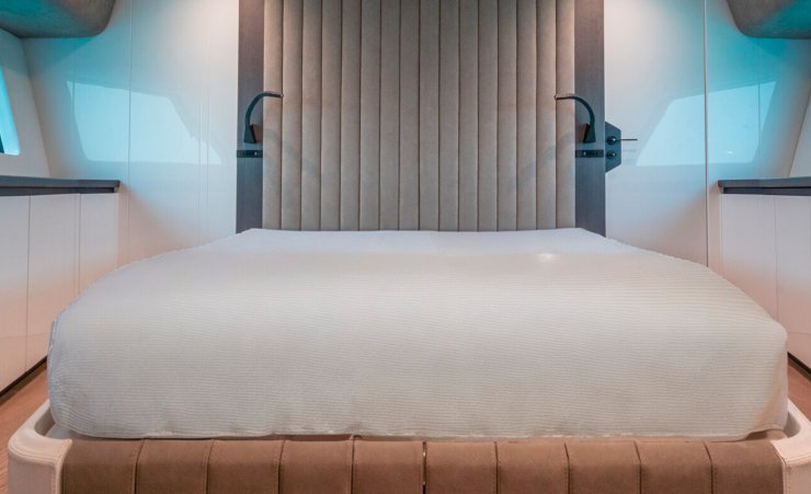 Gli interni, a scelta dell’armatore, si articolano in: 1 cabina armatoriale + salone convertibile 2 cabine + 2 bagni servizio equipaggio . L’altezza libera, rara su molti open di pari misura, consente vivibilità reale. Le superfici opache e i toni neutri limitano la fatica visiva; le luci indirette disegnano volumi senza riverberi.