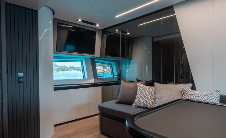 Due cabine e due bagni offrono privacy reale; l’armatoriale mantiene volume e luce naturale grazie a boccaporti e tagli di vetro ben posizionati. La dispensa consente autonomia alimentare di più giorni, mentre il garage ospita tender e toys per attività costiere.