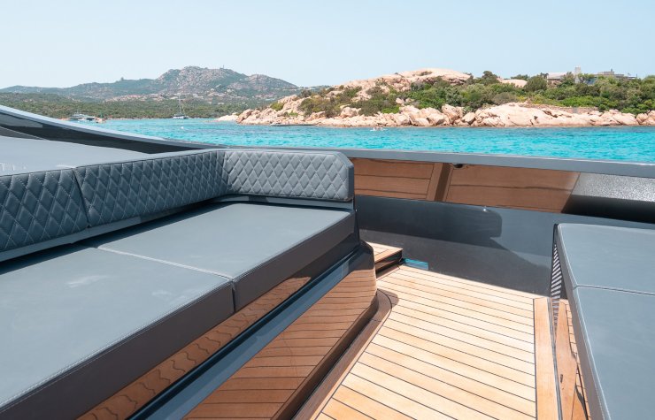 La carena è un planante con deadrise importante al transom e spray rails calibrati per favorire portanza e asciutto in accelerazione. Il baglio generoso aiuta a coniugare stabilità trasversale in rada e volumi di coperta realmente sfruttabili. Le murate plongeant – cifra stilistica del marchio – abbassano la linea di cintura dando “sea proximity” agli ospiti seduti, ma hanno anche un effetto funzionale: convogliano l’acqua lontano dal living riducendo l’overspray a velocità medie.