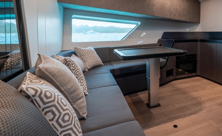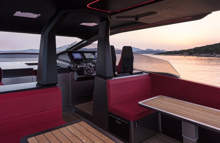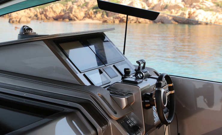 La seduta pilota–co–pilota è modulare, con bolster per guida attiva. La visibilità a 360° è garantita da montanti snelli e specchi laterali correttamente orientati. Il layout dei comandi posiziona drive/trim e thruster in un’unica zona toccabile senza distogliere lo sguardo; il throttle mapping è progressivo per manovre dolci in banchina.
