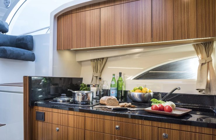 Sottocoperta troviamo una cabina di prua con letto matrimoniale e stipetti a volume pieno, una seconda cabina a mezzanave con cuccetta trasversale e un vano toilette con box doccia separato. La cucina è collocata in basso ma “dialoga” direttamente con il pozzetto grazie ad aperture generose: cuocere e servire all’aperto diventa naturale, senza interrompere i flussi. Altezze e aperture laterali danno respiro agli ambienti; la qualità della luce naturale e la scelta di essenze chiare contribuiscono alla percezione di spazio.