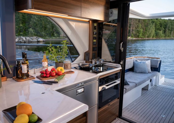 La cucina — pur non esasperata come nella “Gourmet” — resta completa: piani di lavoro generosi, elettrodomestici di fascia premium, stivaggi pensati per l’uso in navigazione (cassetti che non si aprono in rollio, ripiani con battute, guarnizioni adeguate). La distribuzione dialoga con i due saloni, in modo che chi cucina non sia isolato dal resto dell’equipaggio.