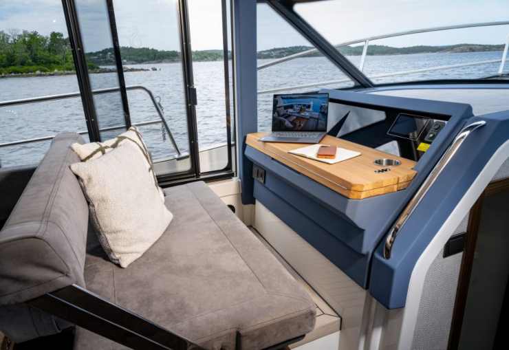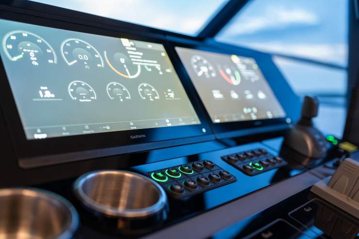 Plancia “glass” con multi-display integrati, gestione di propulsione e trasmissione, rete dati NMEA 2000 e pilotaggio assistito: l’interfaccia è pensata per evitare ridondanze. La logica è essenziale ma completa: tasti fisici per le funzioni critiche, comandi digitali contestuali per ciò che non richiede risposta tattile immediata. La leggibilità è favorita da caratteri grandi e contrasto calibrato per notturna; schermate personalizzabili aiutano il timoniere a privilegiare i parametri che realmente usa.