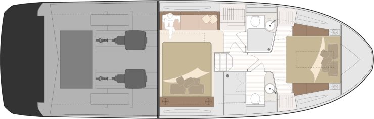 Sottocoperta troviamo due cabine vere. A prua la suite armatoriale con bagno en suite e box doccia separato; a centro barca la cabina ospiti full-beam che sfrutta il baglio massimo, con letti configurabili twin o matrimoniale, armadiature a tutta altezza e luce naturale amplificata da finestrature nello scafo. La privacy è favorita dall’isolamento acustico di paratie e porte, e dalla separazione dei percorsi tra zona giorno e notte.