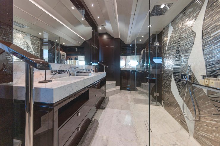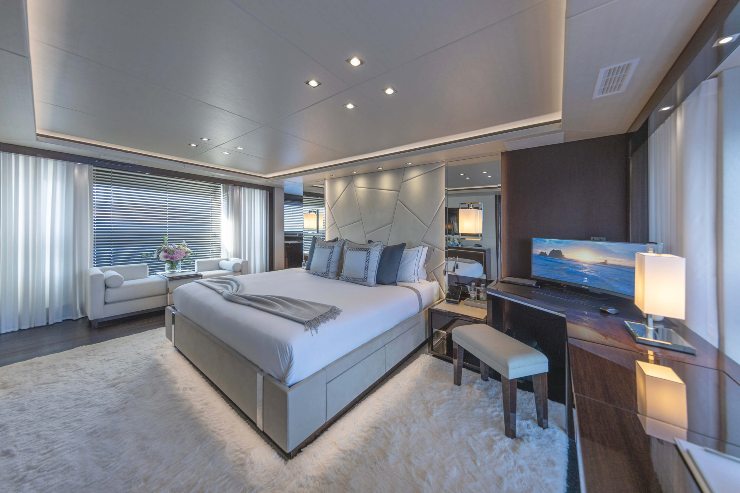 La suite armatoriale full-beam integra area lounge, vanity e un bagno generoso, organizzato per garantire privacy e percorsi intuitivi. Le altre quattro cabine, disposte con criteri di simmetria e ottimizzazione dei volumi, sono dotate di servizi en-suite e armadiature adeguate per settimane a bordo. Ogni cabina gestisce clima e illuminazione in modo autonomo.