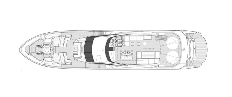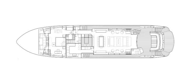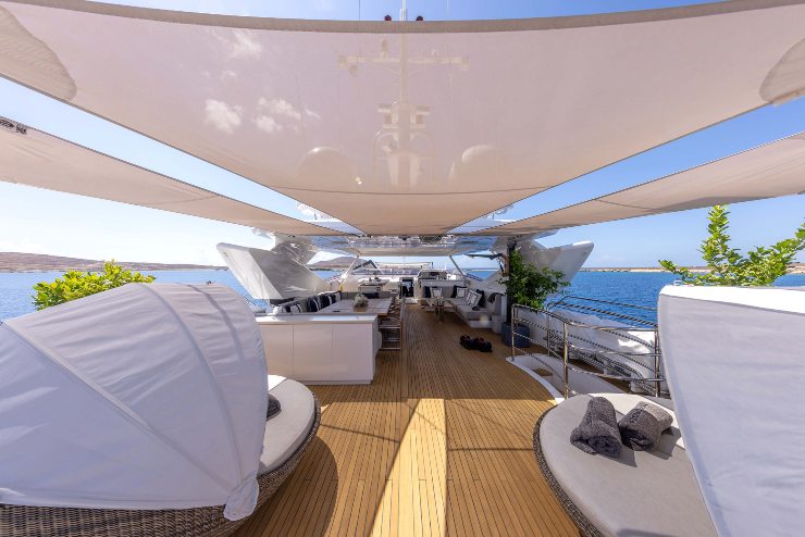 Il ponte superiore ospita un bar completo, zona pranzo e solarium. Il tetto mobile consente di modulare luce e ventilazione: in navigazione riduce l’azione del sole diretto; in rada convoglia una brezza leggera che abbassa la richiesta dell’HVAC nelle aree interne adiacenti.