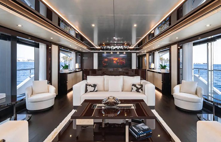 Il ponte principale è concepito come ambiente fluido: ingresso dal pozzetto, zona living, bar e dining con ampie superfici vetrate che dilatano la percezione dello spazio. L’acustica tratta, la temperatura uniforme e la luce indiretta costruiscono un’atmosfera domestica, adatta tanto alla sosta in porto quanto alla navigazione a crociera.