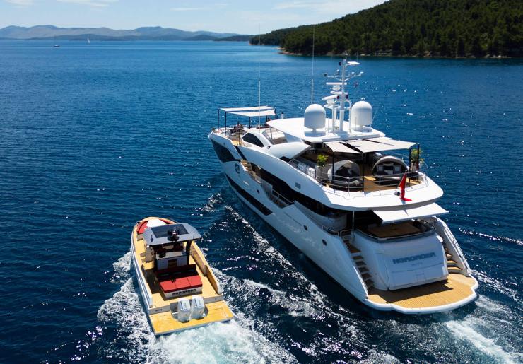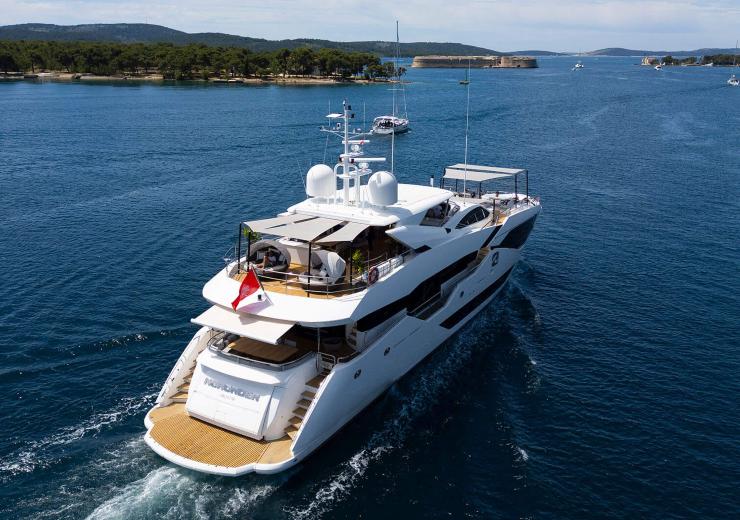 NOROADER, costruito nel 2020 da Sunseeker, è un’unità planante di fascia 35 metri concepita per un impiego intensivo nel Mediterraneo, con impostazione funzionale rivolta al charter di lusso e una piattaforma meccanica dimensionata per garantire affidabilità, autonomia hoteliera e comfort continuo a bordo. Il progetto nasce da una monocarena in composito a V pronunciata, con deadrise progressivo e volumi poppieri capaci di sostenere carichi elevati senza penalizzare l’uscita pulita del flusso alle eliche. L’insieme racconta un’imbarcazione che ricerca un equilibrio strutturale tra tre vettori: spazio vivibile (interni ed esterni), prestazioni sostenibili (crociera confortevole, trasferimenti rapidi quando serve) e fruibilità ergonomica per equipaggio e ospiti.