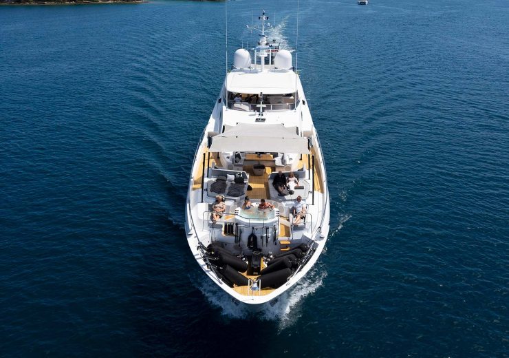 In scalo la barca si muove con precisione: timoneria con feedback chiari, comandi di potenza progressivi, visibilità lato prua e al traverso ben studiata. L’inerzia è quella propria di una 35 metri, ma i sistemi di ausilio alla manovra compensano la massa con efficacia.