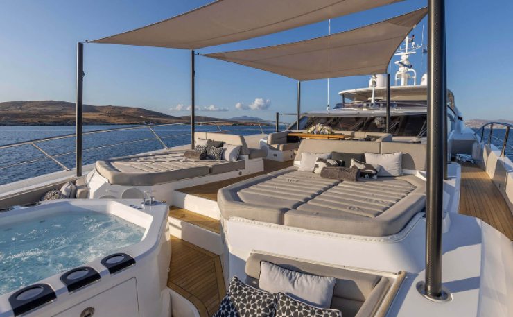La timoneria esterna è supportata da un’area di prua che diventa teatro serale: zona wellness con vasca idromassaggio incassata e impianto di intrattenimento che può trasformarsi in sala proiezioni sotto le stelle. L’orientamento a prua protegge dall’andirivieni del porto e regala una visuale privilegiata sull’ancoraggio.