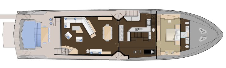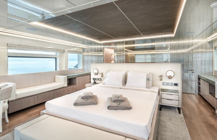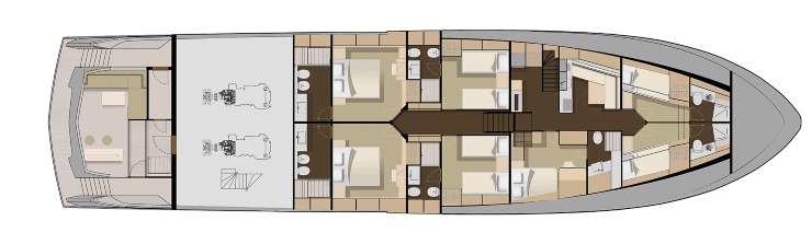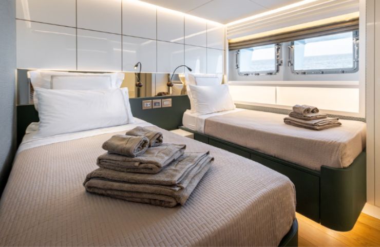 Uno dei punti di forza è la versatilità distributiva. In configurazioni diffuse, si parla di 5 cabine per circa 10 ospiti, spesso con suite armatoriale sul ponte principale e quattro cabine sul ponte inferiore. In varianti più orientate alla privacy o a un utilizzo charter specifico, è possibile riorganizzare i volumi, ottenendo anche 6 cabine e ridefinendo l’equilibrio tra aree sociali e spazi privati. La chiave è che la piattaforma lo consente senza snaturarsi: l’architettura rimane coerente.