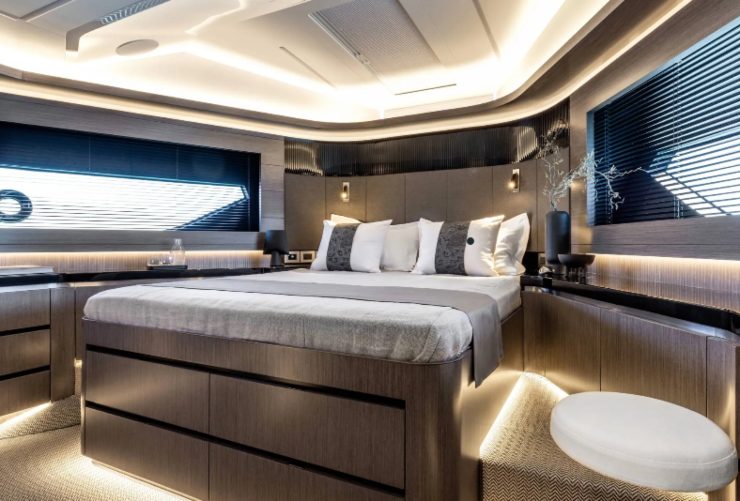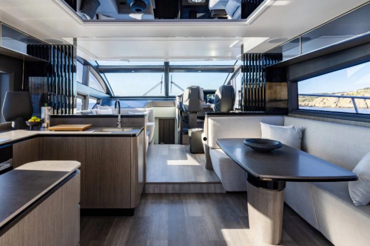 L’atmosfera degli interni non è eccessivamente “hoteliera”: linee nette, materiali caldi e un uso disciplinato dei metalli creano un ambiente contemporaneo, silenzioso anche a velocità di crociera. Dettagli come le maniglie incassate, gli spigoli protetti e le giunzioni a vista controllate denotano un occhio attento a manutenzione e durata estetica.