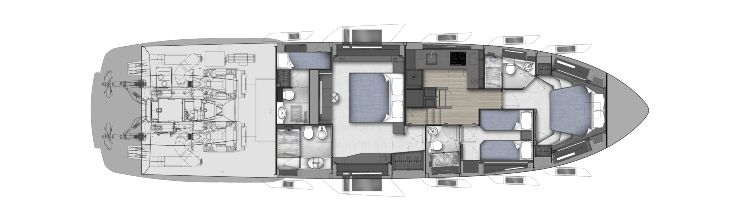 Il layout standard prevede tre cabine: armatoriale a tutto baglio al centro della barca, VIP a prua e cabina ospiti doppia con letti in piano. Ogni cabina dispone del proprio bagno con box doccia separato, piani in materiali compositi di pregio, rubinetterie di fascia alta e un disegno che riprende, in chiave più raccolta, il linguaggio degli spazi comuni. L’armatoriale si distingue per le grandi finestrature rettangolari, il letto centrale king size, le armadiature a tutta altezza e possibili arredi loose (poltrone, panche, piani scrittoio) che si vedono bene nei servizi fotografici dedicati.